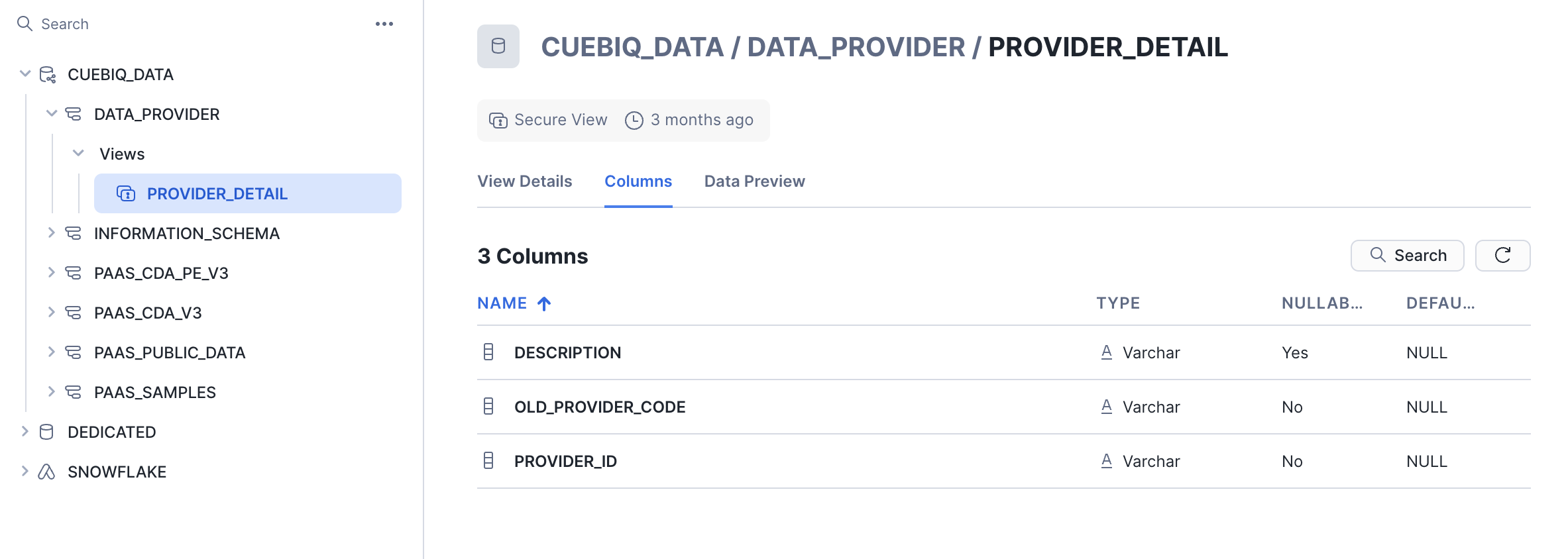 During the migration to Snowflake the provider_id format was update to replace the six digit provider identifier with a user friendly and more accessible phonetic alphabet identifier. To assist with migration a translation table,CUEBIQ_DATA.DATA_PROVIDER.PROVIDER_DETAIL, was created within the CUEBIQ_DATA database.